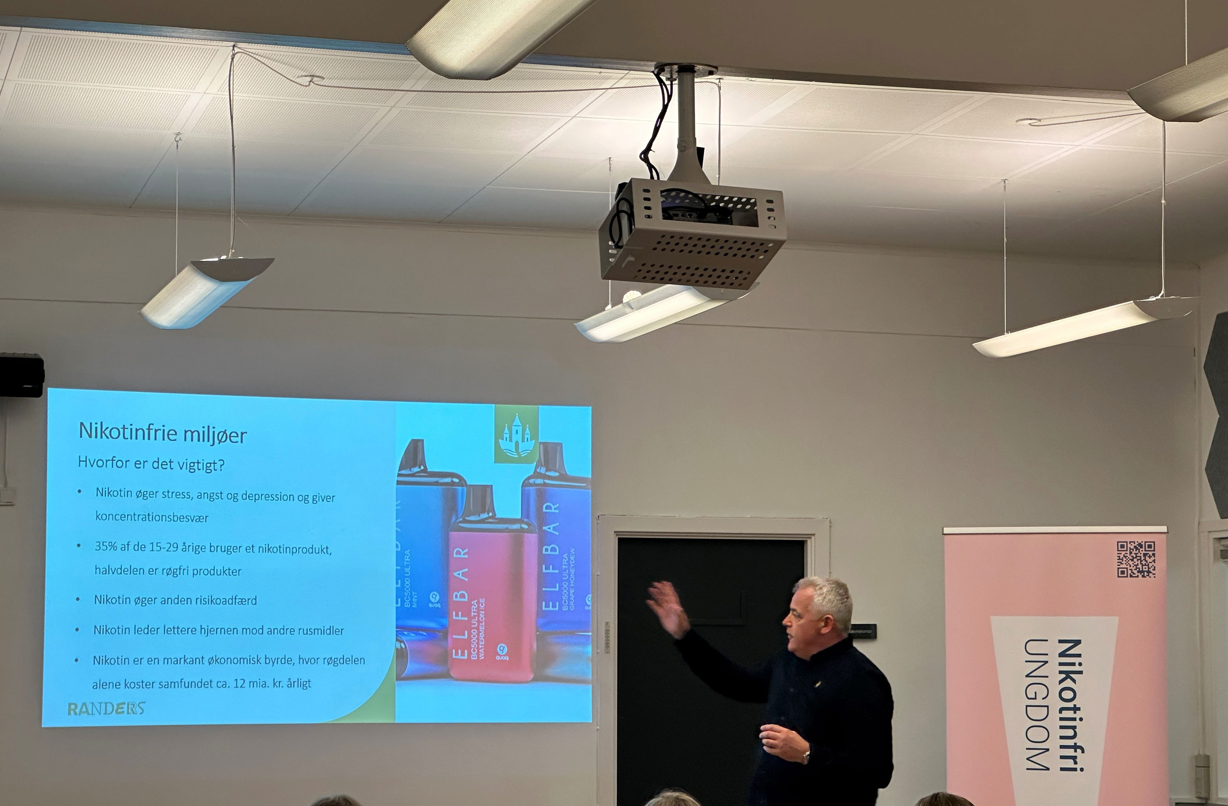 Til workshoppen præsenterede forebyggelseskonsulent i Randers Kommune, Poul Sejr data om den stigende brug af nikotinprodukter blandt unge – især nikotinprodukter som puff- og elfbars med smag af slik eller sodavand. Han fremhævede bl.a., at børn og unge hurtigere bliver afhængige af nikotin end voksne, og at nikotinprodukter kan øge risikoen for angst, stress, depression og give koncentrationsbesvær.